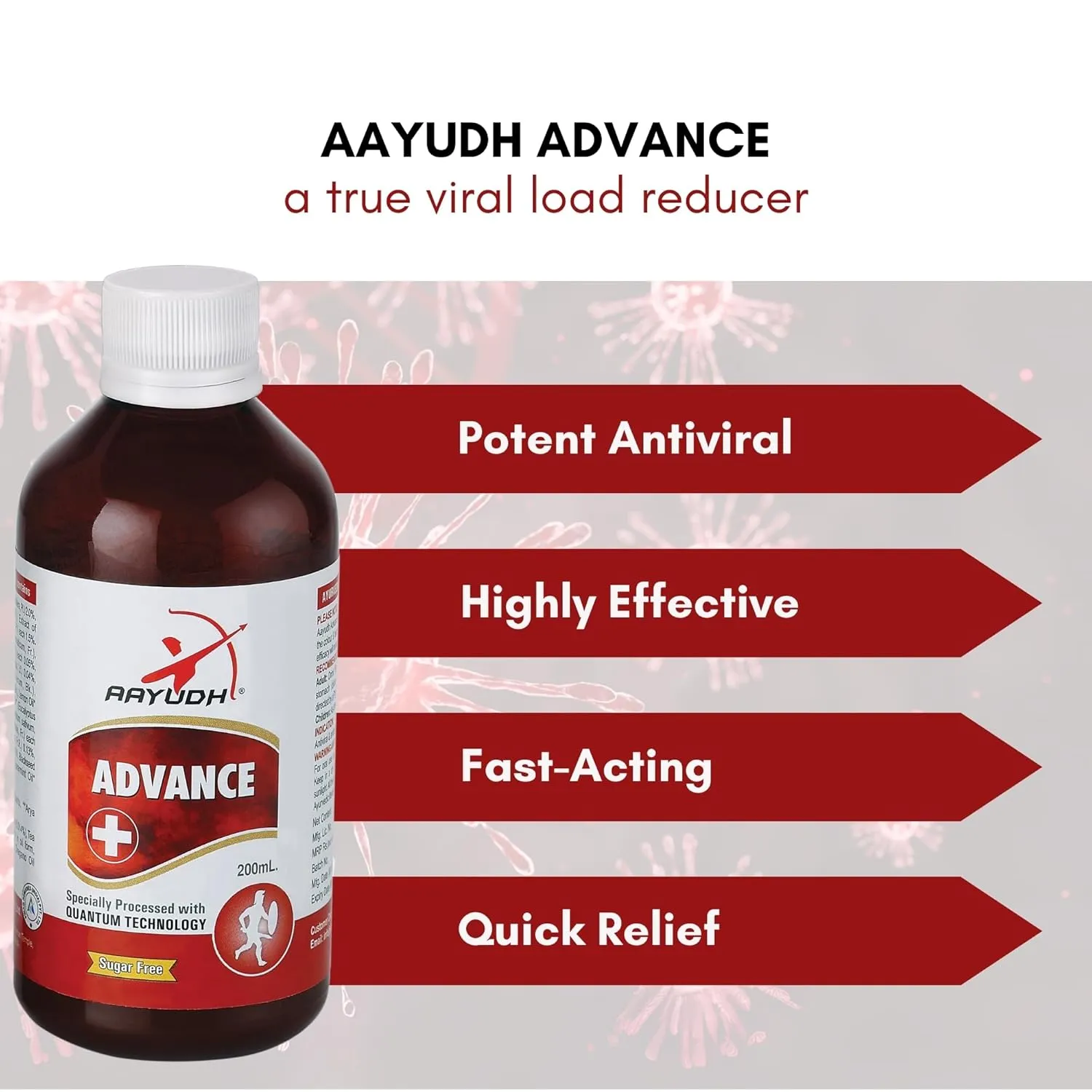 Aayudh Advance + Syrup is a certified Ayurvedic immune booster made from natural extracts like coconut, corn, sugarcane, thyme, and clove. It effectively reduces viral load, and offers strong anti-bacterial and anti-viral benefits. Clinically tested ...Show more