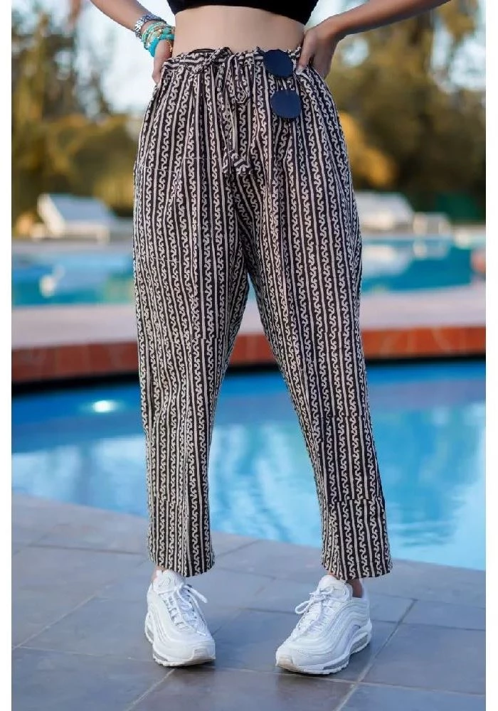 Black Cotton Parallel Pants with Brown Bagru Handblock Print