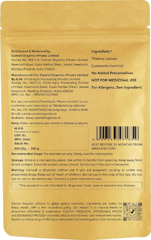 Discover the natural beauty of Carmel Organics Henna Leaves Powder. Perfect for rich, vibrant hair color and conditioning, this high-quality henna powder is made from pure, organic henna leaves. Ideal for creating a long-lasting, natural dye with a d ...Show more