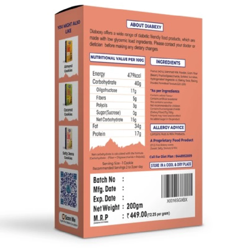 Diabexy Peanut Cookies, the perfect guilt-free treat for peanut butter lovers! These delicious cookies are crafted with high-quality ingredients, offering a delightful crunch and rich flavor without the added sugar. Ideal for snacking or enjoying wit ...Show more