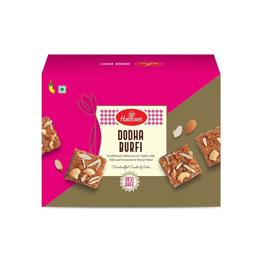Haldiram's Dodha Barfi is a traditional Indian sweet crafted from rich, creamy milk fudge and desi ghee, generously adorned with shredded coconut and crunchy cashews. This unique treat offers an exceptional taste and texture, making it the perfect gi ...Show more