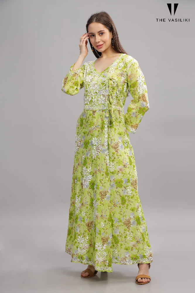 Flowery Green Mulmul Cotton Anarkali Gown with White Chikankari Embroidery