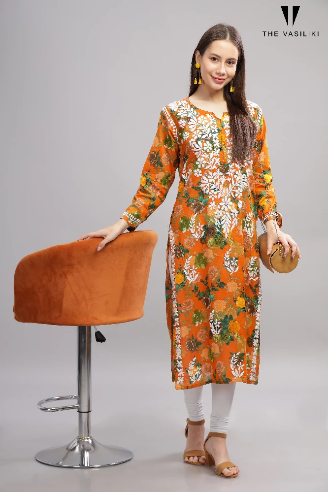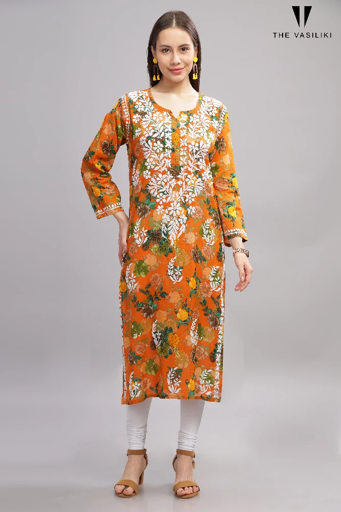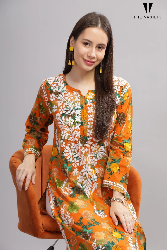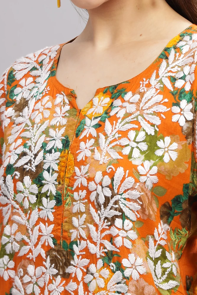 flowery-orange-cotton-kurti-with-white-chikankari-embroidery