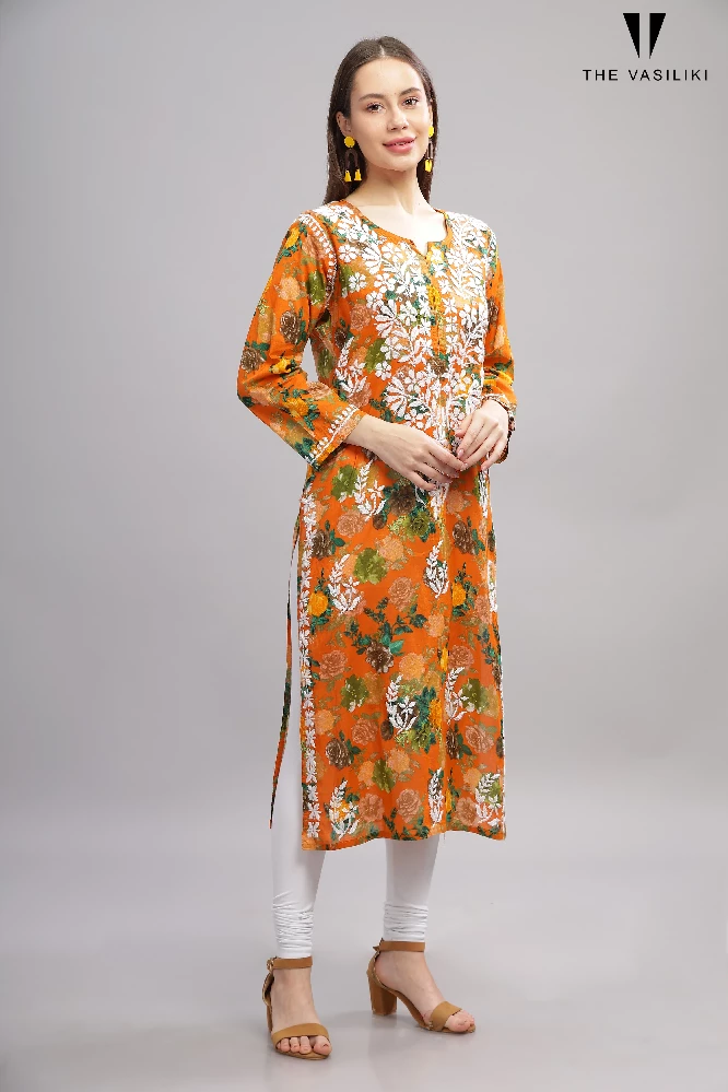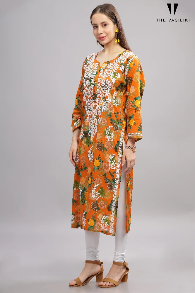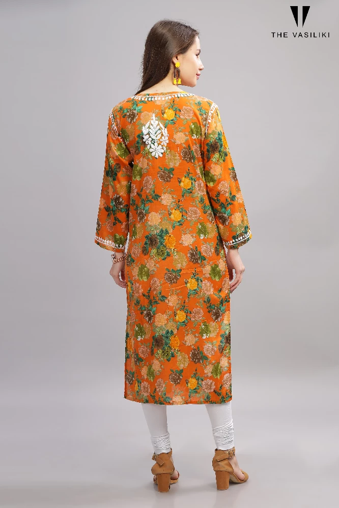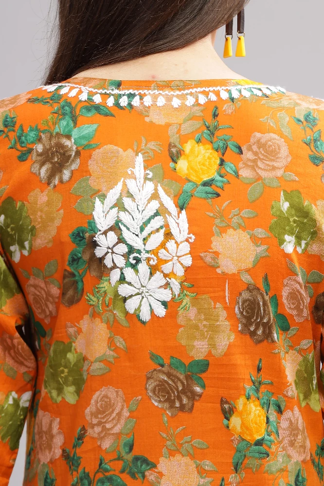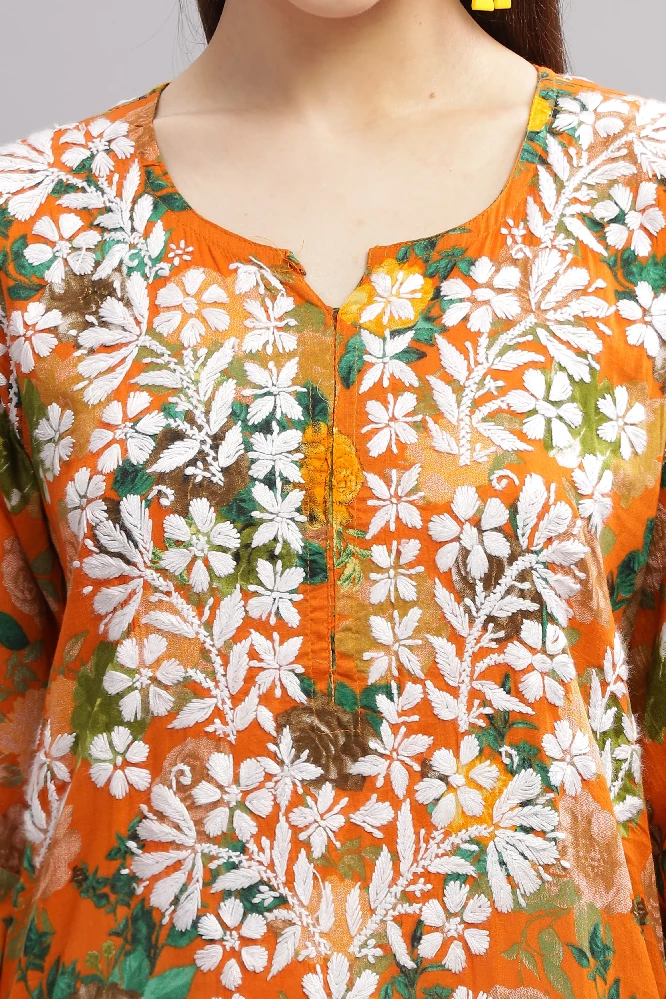 Flowery Orange Cotton Kurti with White Chikankari Embroidery