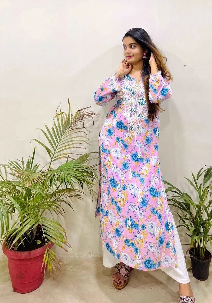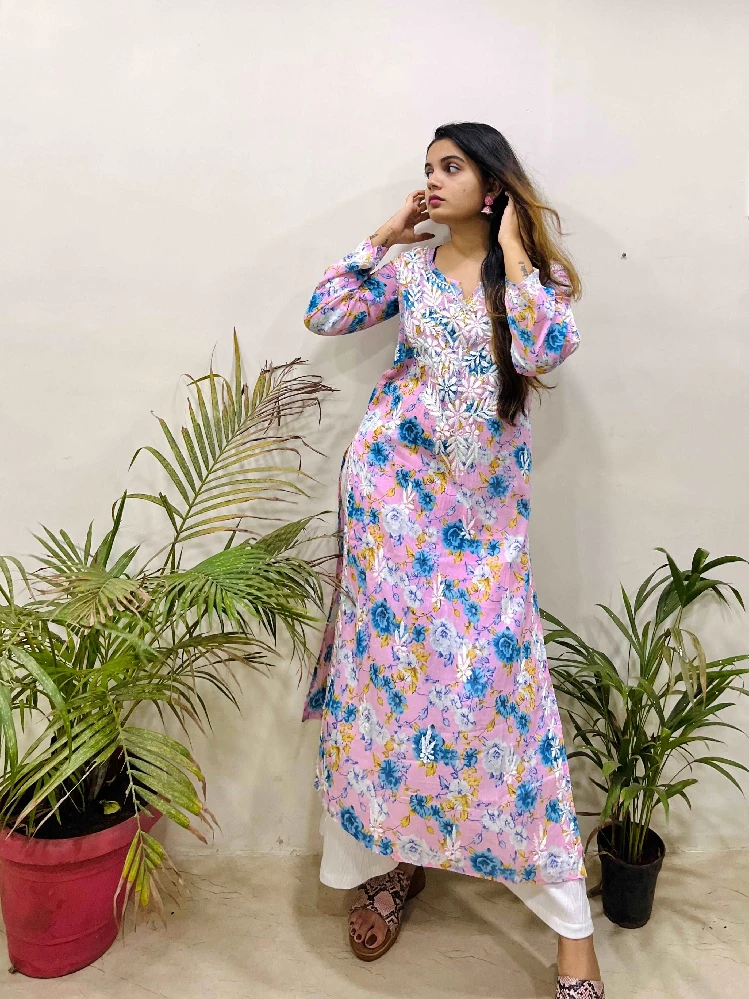 Flowery Pink Cotton Kurti with White Chikankari Embroidery-1.webp
