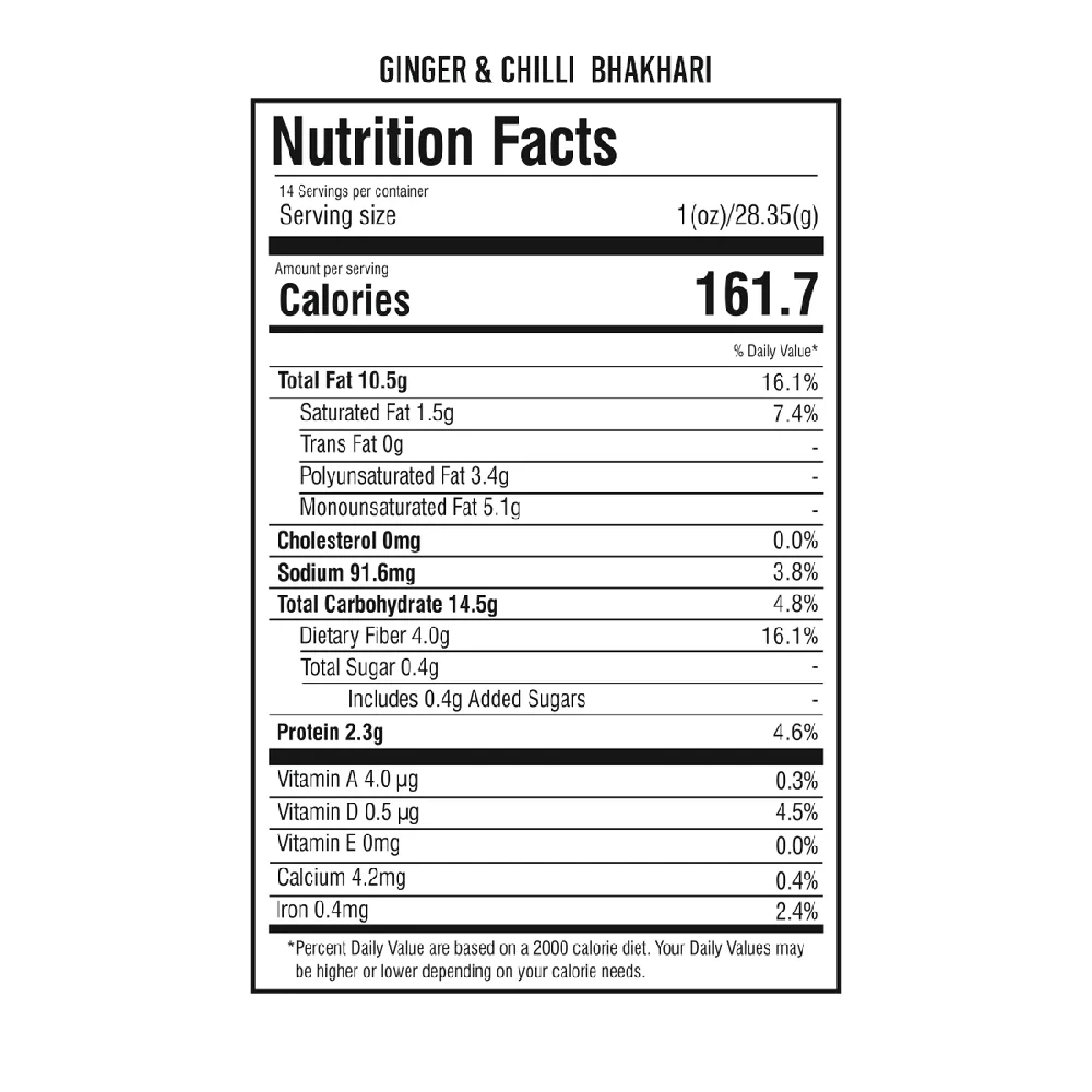 Ingredients Wheat Flour, Ginger Powder, Green Chill Powder, Sesame Seeds,Turmeric, Asafoetida, Salt, Edible Vegetable Oil. ...Show more