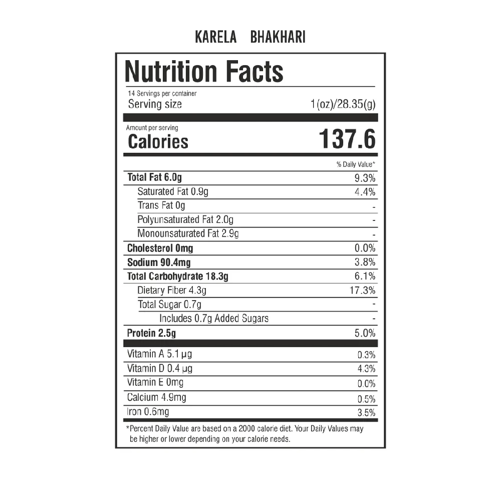 Ingredients : Wheat Flour, Ginger Powder, Karela Powder, Fenugreek seeds Powder Turmeric, Sesame seeds, Hing (Asafoetida), Salt, Edible Vegetable Oil. ...Show more