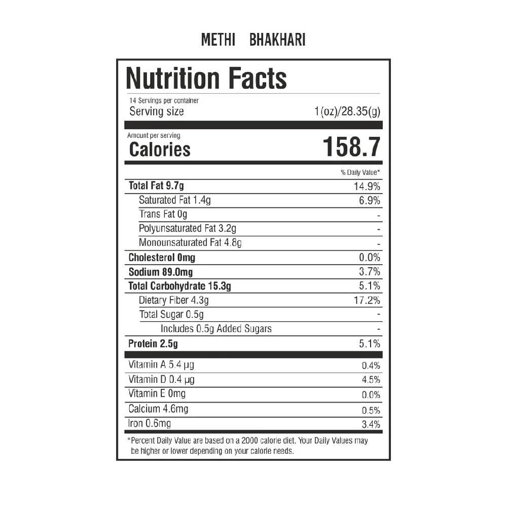 Ingredients Wheat Flour Fenugreek Seeds Powder, Chilli Powder, Sesame Seeds, Turmeric, Hing (asafoetida Powder),salt, Edible Vegetable Oil ...Show more