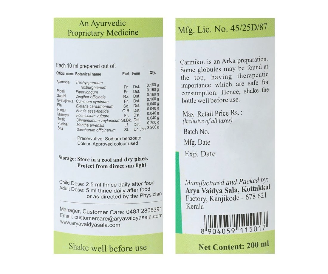 Kottakkal Ayurveda Carmikot Syrup is a herbal product that can help to enhance your digestive system and reduce stomach aches, swelling, inflammation, excessive gas formation and indigestion. It can help to reduce abdominal gas and relief abdominal c ...Show more