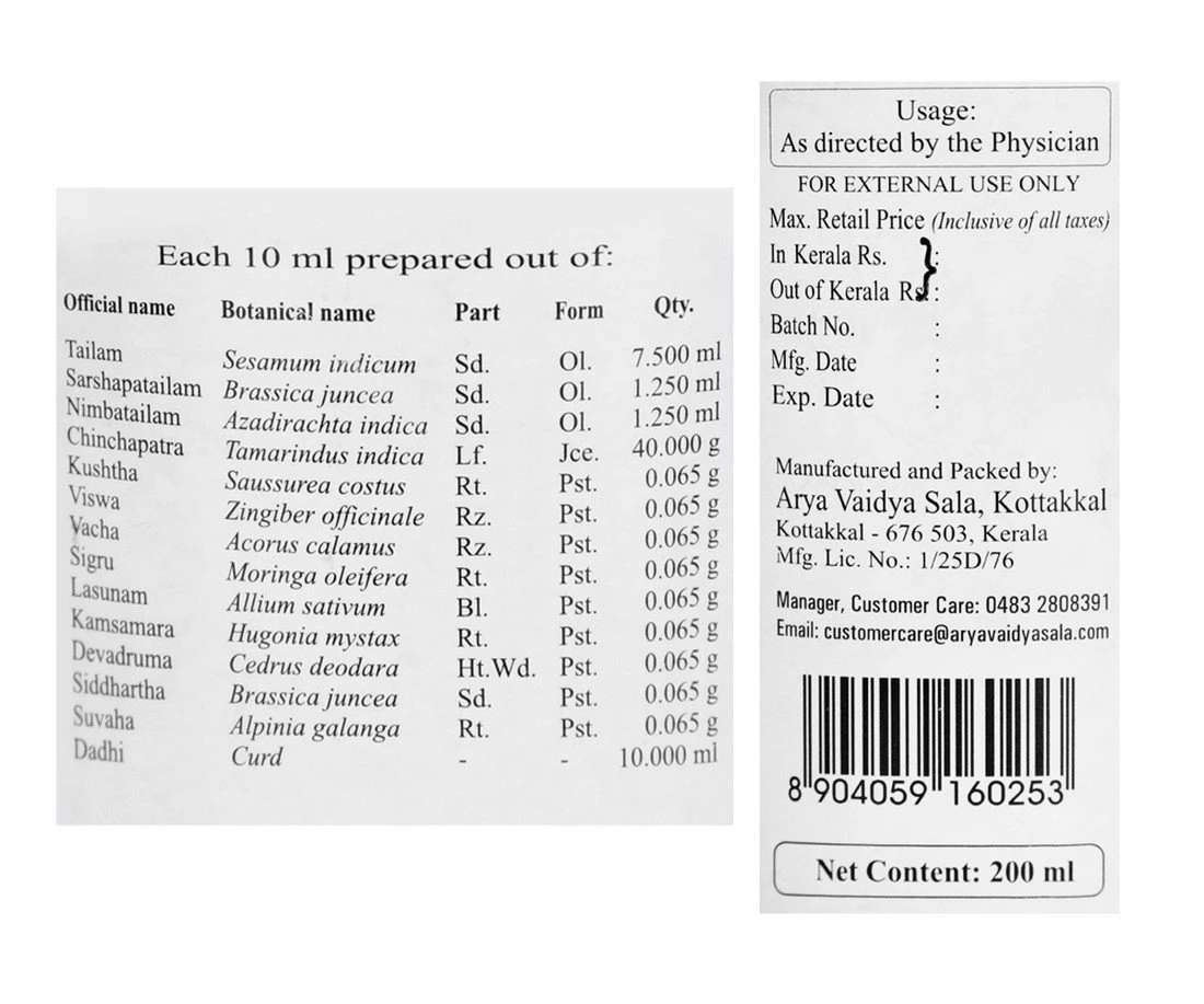 Kottakkal Arya Vaidyasala Kottamchukkadi Tailam, 200 ml-1.webp Kottakkal Arya Vaidyasala Kottamchukkadi Tailam, 200 ml-2.webp Kottakkal Arya Vaidyasala Kottamchukkadi Tailam, 200 ml-3.webp