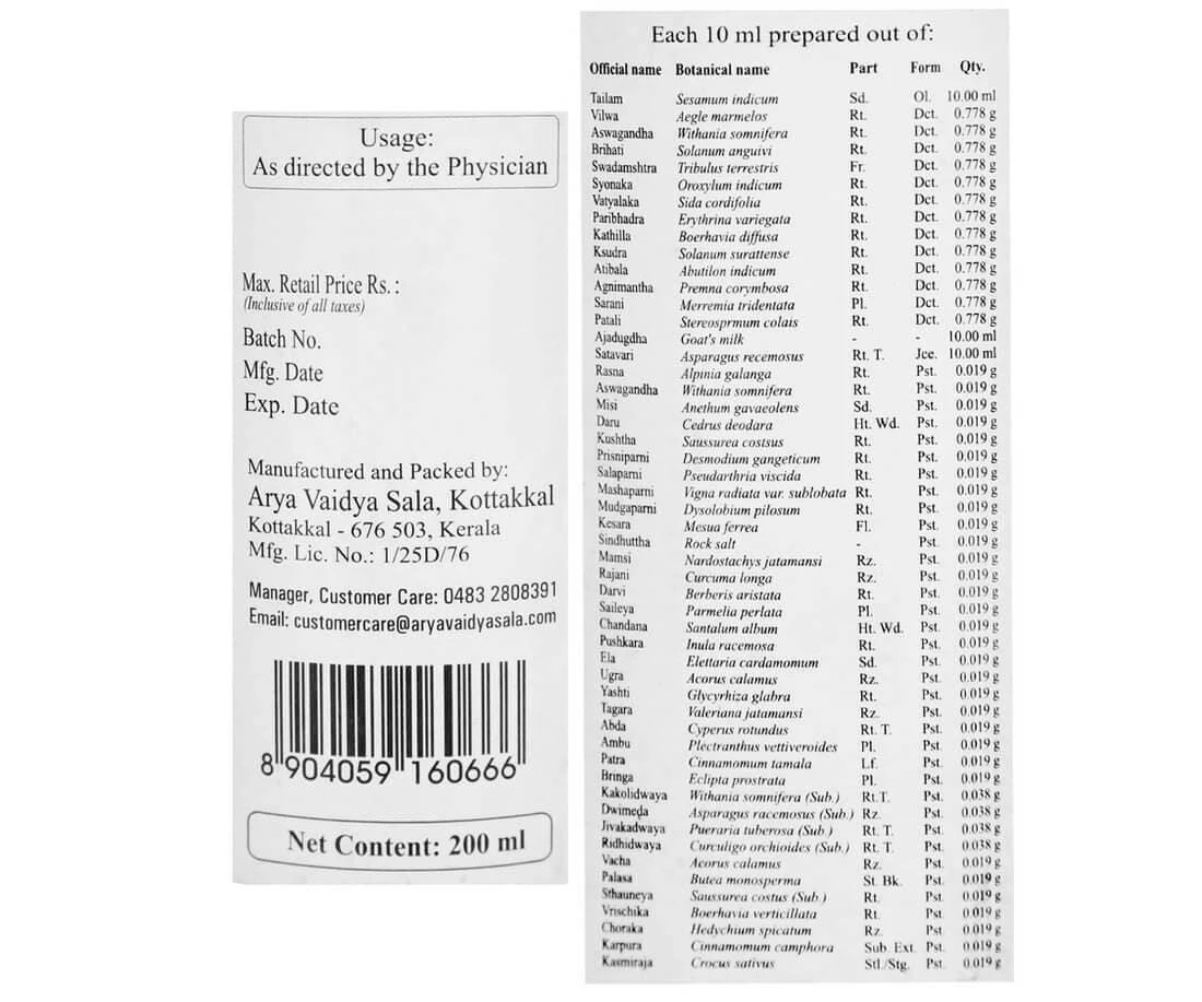 Kottakkal Arya Vaidyasala Mahanarayana Tailam, 200 ml-1.webp Kottakkal Arya Vaidyasala Mahanarayana Tailam, 200 ml-2.webp Kottakkal Arya Vaidyasala Mahanarayana Tailam, 200 ml-3.webp