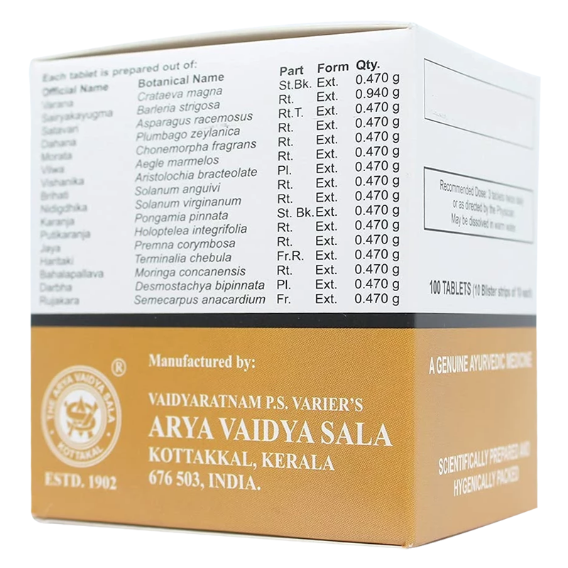 Arya Vaidya Sala Kottakkal Varanadi Kwatham Tablet is an ayurvedic medicine that is primarily used for the treatment of Obesity, Headache, Tumour, Arthritis, Indigestion. ...Show more