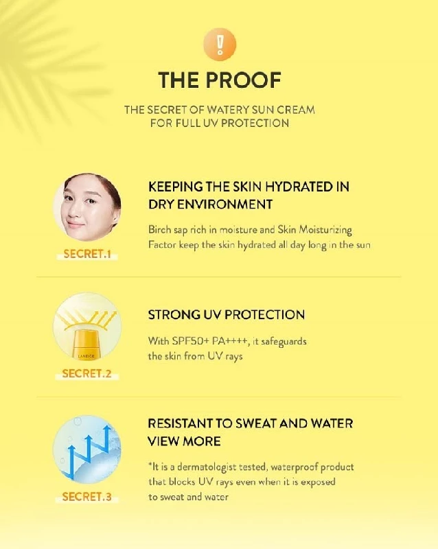 Shield your skin with Laneige Watery Sun Cream SPF50+ PA++++! Experience ultimate UV protection and hydration in one. Its waterproof formula withstands sweat and water, ensuring your skin stays moisturized and protected. Say hello to radiant, sun-saf ...Show more