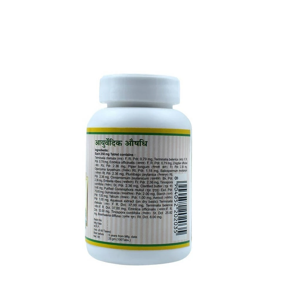 Amritadi Guggulu is an ayurvedic medicine used to treat gout, arthritis, piles, skin diseases and constipation. CONTAINS 100 TABLETS THERAPEUTIC INDICATIONS ? Gout ? Piles ? Fistula in ano ? Acne ? Wounds ? Liver disorders ? Rheumatoid arthr ...Show more