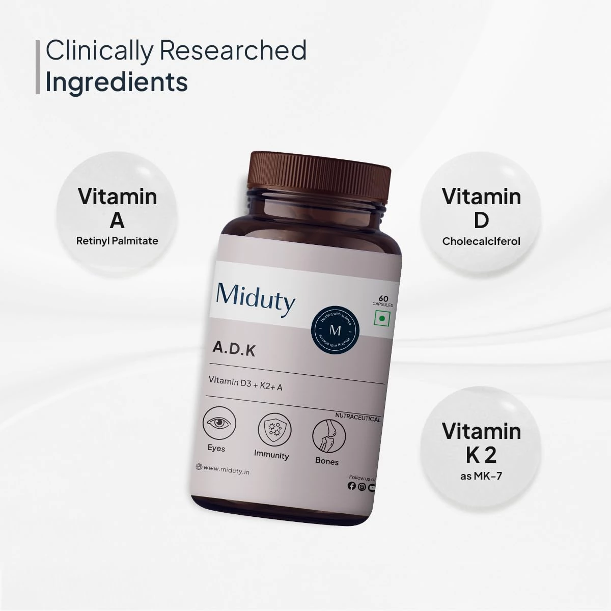 Miduty Vitamin ADK Supplement combines the power of Vitamins A, D3, and K2 to support bone strength, immune health, and cardiovascular wellness. This advanced formula ensures optimal calcium absorption and distribution, promoting joint health and ove ...Show more