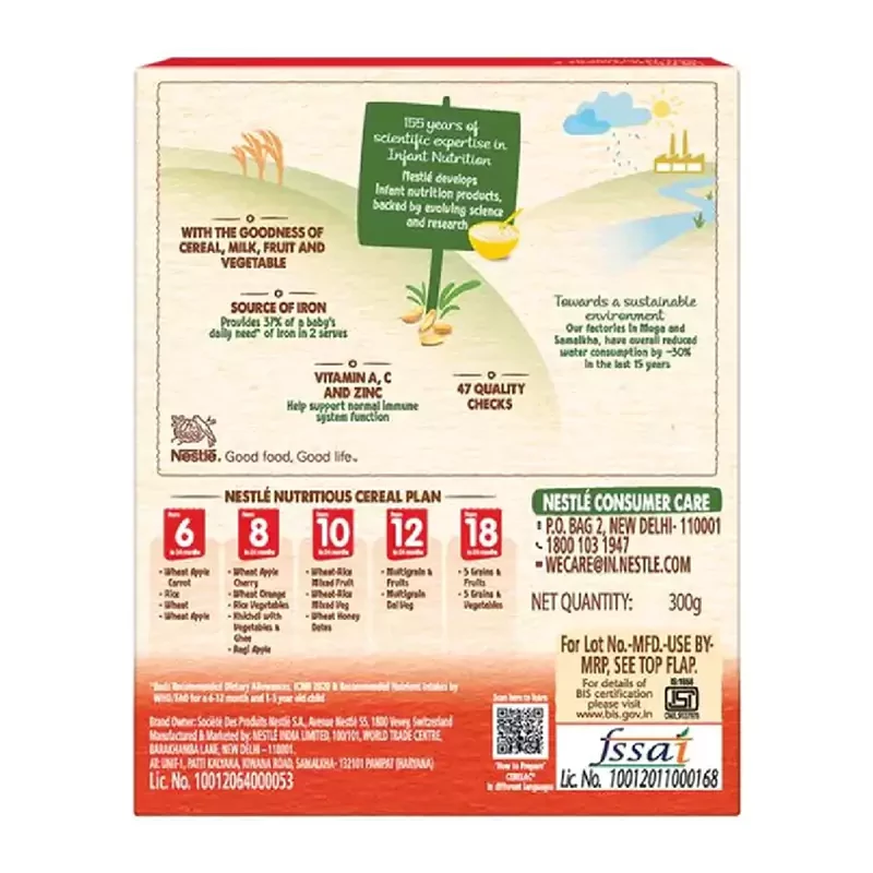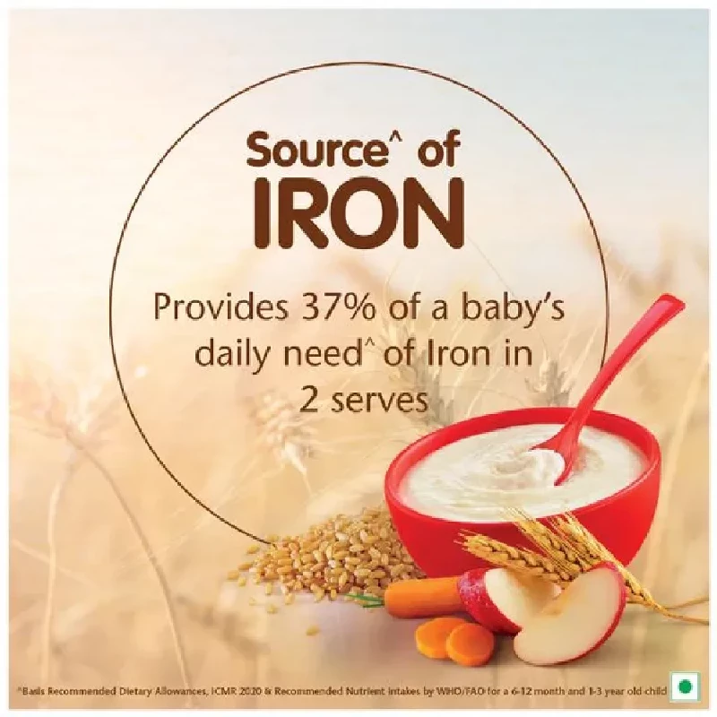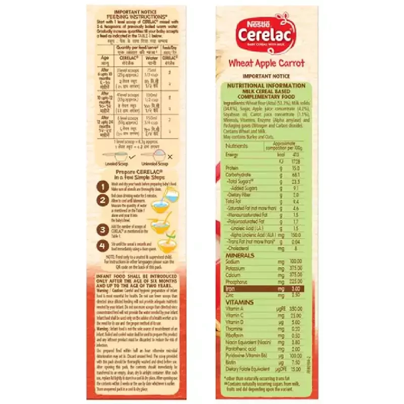Nestle Cerelac Baby Cereal with Milk, Wheat Apple Carrot is a complementary food for babies from 6 to 24 months. While infants and children have higher requirements of nutrients than adults, 2 serves of Cerelac Wheat Apple Carrot Cereal provides 37% ...Show more