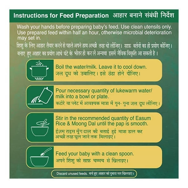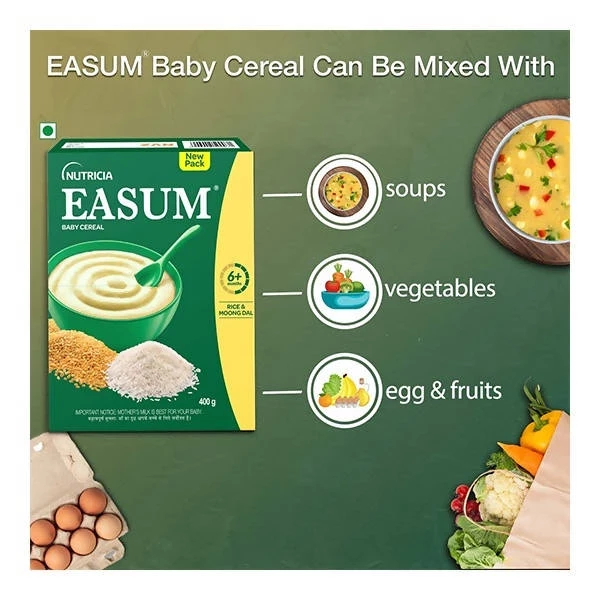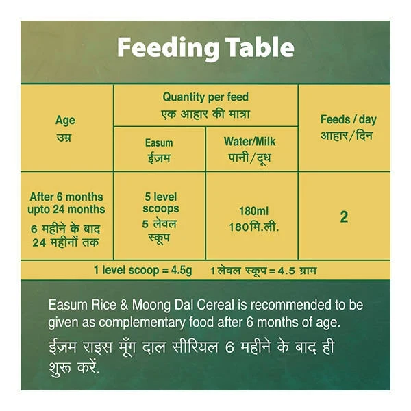 Easum Rice & Moong Dal Cereal is simple to digest first solid food for babies. Easum is made from quality Rice & Moong Dal flour, pre-cooked and enhanced nutritionally to suit your baby’s tender digestive system ...Show more