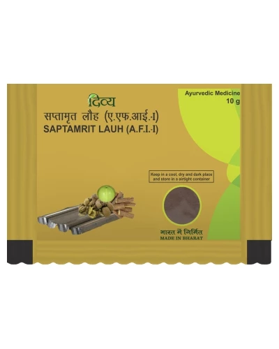 Saptamrit Lauh is iron calx (bhasm or ashes). This Ayurvedic formulation from Patanjali Divya Pharmacy helps improve eye and stomach problems. The high iron content works in the treatment of vomiting, fever, tiredness, vision-related problems, genera ...Show more