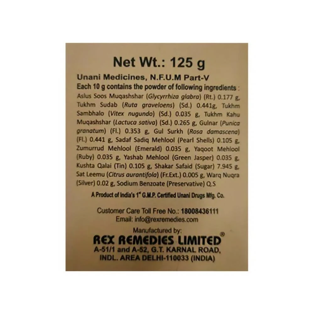 Ingredients: Asl-us-Soos Muqashshar Tukhm Sudab Tukhm Sambhaloo Tukhm Kahu Muqashshar Gulnar Gul Surkh Sadaf Mehlool Zamurrud Mehlool Yaqoot Mehlool Yashab Mehlool Kushta Qalai Shakar Safaid Sat Leemun Warq Nuqra ...Show more