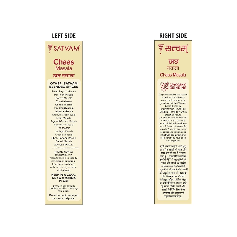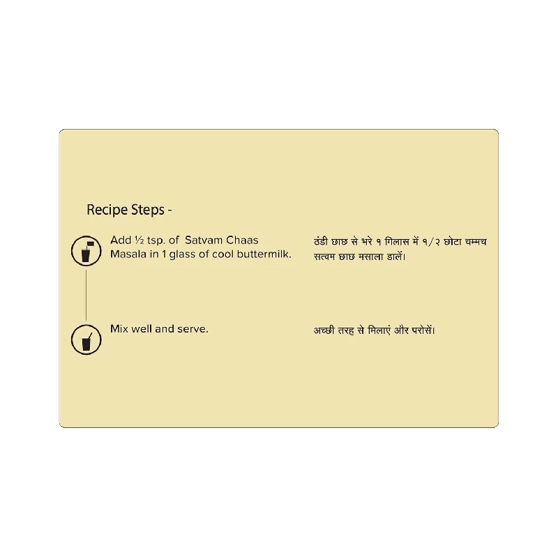 Satvam Chaas-Buttermilk Masala, expertly crafted to elevate your buttermilk experience. This flavorful blend combines traditional spices that enhance the refreshing taste of chaas, making it a perfect addition to your meals. Simply mix with chilled ...Show more