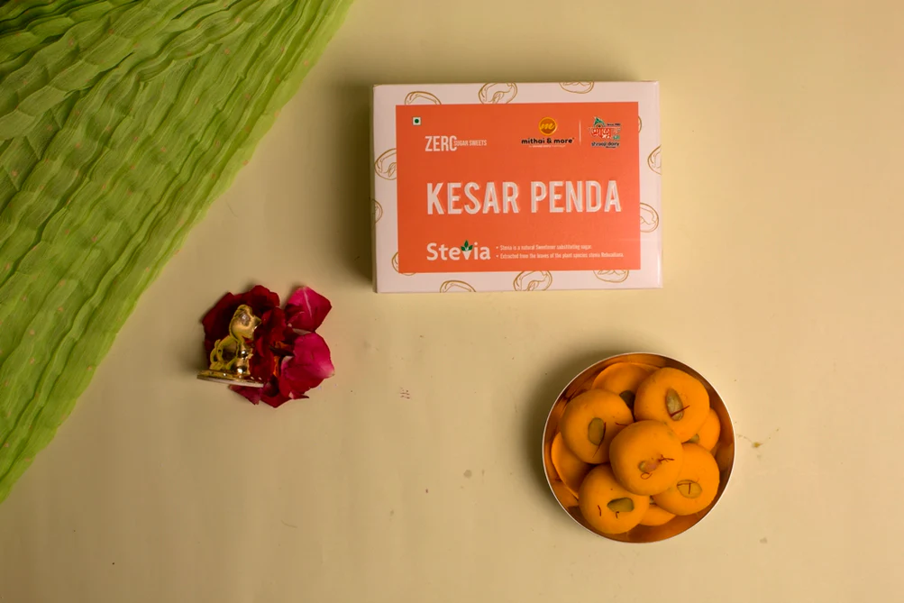 Filled with the richness of saffron and the goodness of Almonds, Kesar Penda makes for a flavorful delight. The saffron brings in a great flavor and the Almonds offer some crunchiness. Available in a low-calorie option, our Stevia Kesar Penda is idea ...Show more