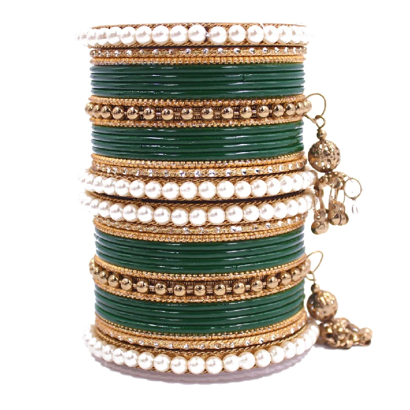 Traditional Designer Pearl & Jhumki Bangles Set-Imitation Jewellery, Green (173119)-1.webp Traditional Designer Pearl & Jhumki Bangles Set-Imitation Jewellery, Green (173119)-2.webp