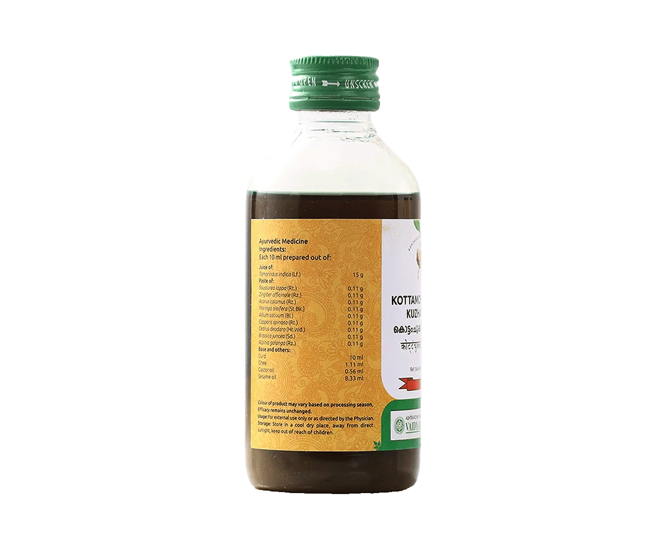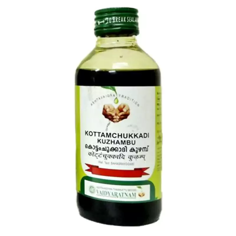 Vaidyaratnam Kottamchukkadi Thailam is a very effective ayurvedic medicine in acute Rheumatic disorders. Kottamchukkadi Thailam is an Ayurvedic oil used in the treatment of Vata disorders causing neuromuscular pains, sciatica, spondylosis, etc ...Show more
