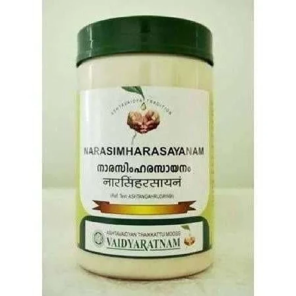 Vaidyaratnam Narasimha Rasayanam is an Ayurvedic formulation. This herbal decoction may be useful to boost body strength and immunity. Taste: Sweet Form: Paste Type: Herbal supplement Ideal for: Children and adults Gender: Both men and women ...Show more