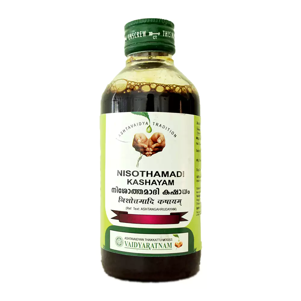 Vaidyaratnam Nisothamadi Kashayam or Kashaya is an Ayurvedic tonic. This herbal decoction may be useful in skin diseases caused due to Pitta and Kapha dosha. Form: Liquid Type: Herbal supplement Ideal for: Children and adults Gender: Both men and ...Show more