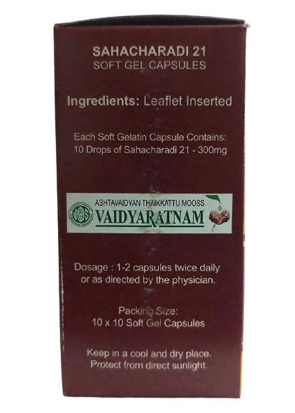 Vaidyaratnam Sahacharadi 21 Soft Gel Capsule is a Ayurvedic treatment against symptoms of rheumatic conditions. It is especially effective in ailments of the lower body like lumbago, varicose veins and also against mental disorders. ...Show more