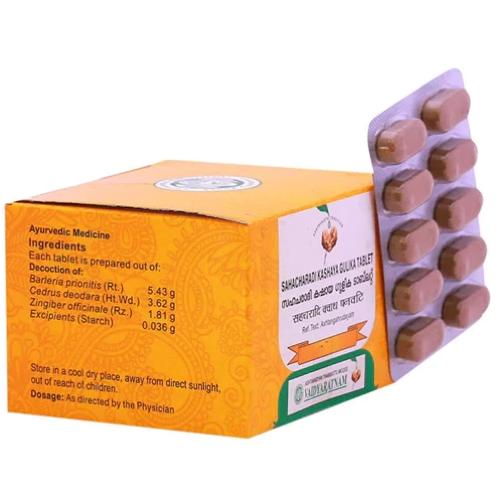 Vaidyaratnam Sahacharadi Kashaya Gulika is an Ayurvedic formulation. This herbal supplement is traditionally used for pain relief. Form: Capsules Ideal for: Adults Type: Herbal supplement ...Show more