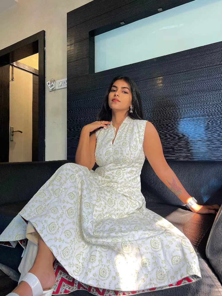 White Chelsea Sanganeri Hand Print Dress-1.webp