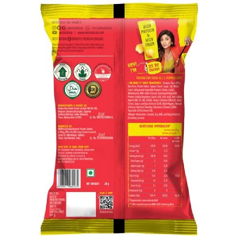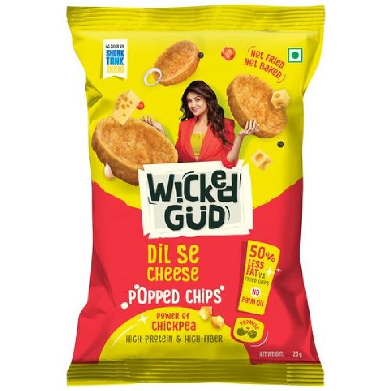 Savor the irresistible taste of WickedGud Chickpea Popped Chips in Dil Se Cheese flavor. Crafted from wholesome chickpeas and enriched with a rich cheese seasoning, these chips offer a crispy texture and a burst of cheesy goodness. Perfect for a sati ...Show more